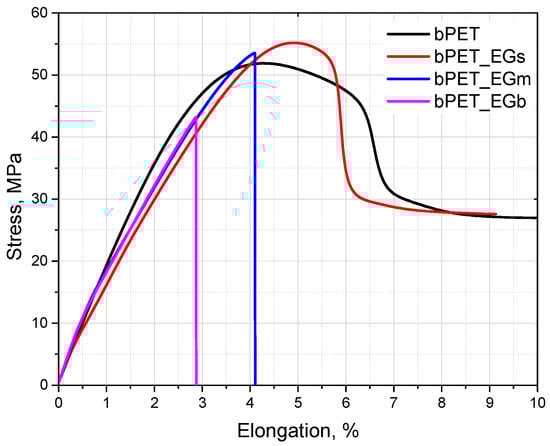 Three fractions of ground EG were used to modify bioPET: small (EGs), medium (EGm), and large (EGb). Table 1 presents the results of an analysis of particle sizes, while Figure 1 displays the EG particle size distribution curves.