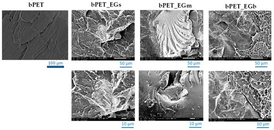 The addition of EG increased the stiffness of the bioPET-based composites regardless of the particle size of the waste filler. In the case of the smallest particles, an increase in tensile strength was observed. A clear dependence between the particle size and the strength of the biocomposites was observed. Cree and Soleimani manufactured PLA composites via injection moulding with waste eggshell (63 μm and 32 μm) contents of 5, 10, and 20 wt.% [18]. The composite tensile strengths and flexural strengths were the best when the filler loadings were 5 wt.% and 10 wt.%, respectively, for both filler types. However, these values were lower than those of the unmodified material. Both the tensile modulus and flexural modulus increased with an increase in filler loading. The highest impact strength for the composites was obtained at a filler loading of 5 wt.% for both filler types and was slightly better for smaller particles sizes. In the case of the bPET modification in this work, a slight increase in strength from 52 to 55 MPa was obtained after adding 10% of the smallest filler fraction. This is a promising result because of the possibility of reducing the polymer matrix while maintaining appropriate mechanical properties. The modification of bPET with the use of EGs increased the stiffness by about 35%, but large flat particles, as shown in Figure 3, reduced the strength to about 30%. This is probably related to the lower adhesion of large flat shell waste due to areas with lower wettability. Some large particles could have been arranged perpendicularly to the sample axis during the injection process, which would have significantly increased the stiffness but weakened the strength of the biocomposite as the tensile forces would act transversely to the surface of large flat shells. SEM images of the biocomposites modified with EG are shown in Figure 4.