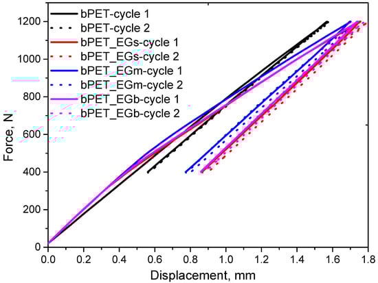 Based on the juxtaposition of the first and second hysteresis loops, it was found that the addition of EG increased the stiffness of the biocomposites in the first parts of the hysteresis loop (for smaller deformations), when the interactions between the fibre and the matrix were more active. Later, the loop slope decreased, indicating that the processes related to the matrix deformation began to dominate. The largest deformations in the first parts of the hysteresis loop correspond to the biocomposites with smaller particles.