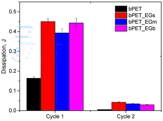 It was found that the addition of EG waste increased the mechanical energy dissipation in the first hysteresis loop almost by a factor of three (Figure 6). With the progressive process of the low-cycle fatigue of the tested samples, the dissipation values decreased almost tenfold after 20 cycles. In both the first and the twentieth cycles, the highest dissipation values were achieved by the composite with the smallest EG addition. This indicates better adhesion of the smallest EG particles to the polymer matrix compared to the other EG fractions.