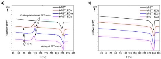 The influence of EG on the bPET polymer matrix behaviour was assessed by looking at the thermal properties of the composites. Differential Scanning Calorimetry (DSC) was conducted through a series of heating and cooling cycles: initial heating, cooling, and then a second round of both. The DSC curves from the first and second heating cycles are shown in Figure 7. The glass transition temperature (Tg) of the bPET matrix, observed as a step change in heat flow around 70 °C, was unaffected by the addition of EG fillers. However, EG particles had a notable impact on the crystallization behaviour of the bPET polymer. They inhibited the crystallization of PET, leaving the matrix in an amorphous state below Tg. During the gradual heating process of the bPET composites, the increased mobility of the polymer chains facilitated cold crystallization, indicated by an exothermic peak between 100 °C and 130 °C. Additionally, a melting peak of the bPET polymer matrix was observed at around 240 °C. In the second heating cycle, only the Tg step transition and melting endothermic peak were visible. Moreover, the presence of EG particles affected the overall crystallinity of the bPET matrix, which may, in turn, have influenced the mechanical properties of the composites.