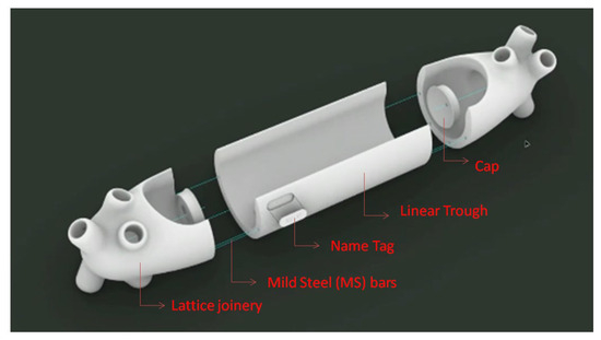 The FLOAT trough is a revolutionary unit comprising three integral components that transform water distribution and enhance functionality while minimizing material waste. As illustrated in Figure 2, the first component strategically places bamboo poles or lattice structures at corners for stability and durability, incorporating a concealed irrigation system within bio polymer-printed troughs. Sustainable bamboo poles contribute strength and facilitate an efficient irrigation mechanism within their hollow conduits. The second component is a biopolymer-printed linear trough designed for soil containment and distribution, optimizing crop growth with targeted irrigation and drainage holes. Concealed caps form the third component, acting as protective covers and adding an aesthetic touch. A nodal support system ensures structural stability, accommodating various lattice configurations for adaptability. This groundbreaking construction, printed in three parts, reduces material waste and sets a new standard for sustainable manufacturing. Connecting parts with mild steel bars enhance durability, making the trough suitable for diverse agricultural settings, and practical features like name tags streamline organization for efficient irrigation system maintenance.