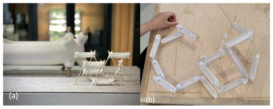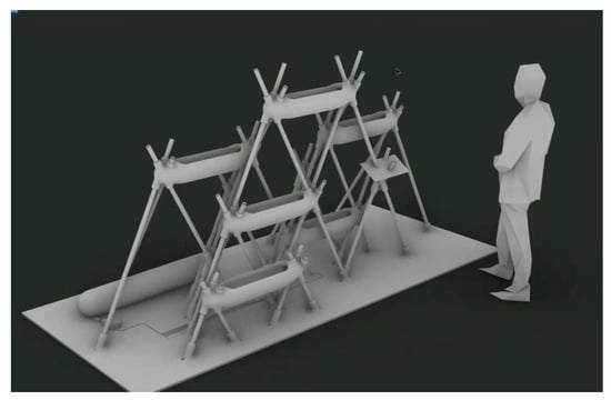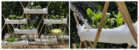 At the “Circular Futures—Next Gen” exhibition at the National Design Centre in Singapore, a full-scale 1:1 FLOAT system as shown in Figure 15, constructed from recycled PETG and arranged linearly, was exhibited. The exhibition aimed to educate the public about food security within a circular economy framework, emphasizing sustainability in both food production and waste management. Key elements included the use of 3D-printed biopolymer rPETG plastics and bamboo lattice structures, illustrating their potential for circular material usage. The elegant yet simple design of the FLOAT system was showcased, along with its bespoke connection system, highlighting its adaptability and versatility. This demonstration emphasized the principle of circularity, where materials are repurposed and given new life rather than being disposed of.