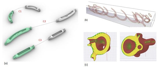 (a) Troughs along desired path curve (b) Section cuts [Linear Trough] (c) Infill pattern/density.