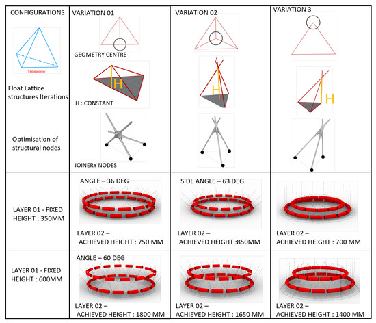 Throughout the iterative design process, several digital models were developed as shown in Figure 7 to evaluate the structural layout and assess the stability of the lattice geometry. This iterative approach provided crucial feedback on the performance and durability of the design. To enhance the feasibility of the lattice structure, additional FLOAT troughs were introduced based on the layouts in vertical layers. These strategically placed troughs aimed to improve the support and stability of the lattice system. By carefully considering the placement of these additional troughs, the overall functionality and strength of the design were improved.