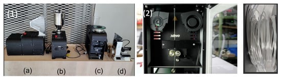 (1) Exploration into recycling plastic wastes with (a) Shredder, (b) Dryer, (c) Filament Extruder, (d) 3D Printer, (2) Filament Extrusion process.