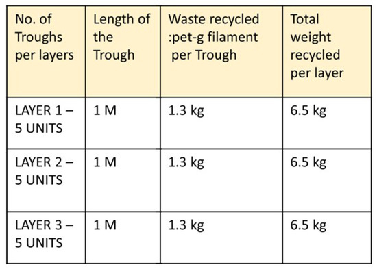 For the bespoke 3D-printed biopolymer trough planters, PETG is identified as the ideal material in the initial selection process. The study [44] explores recycling PET-based foil waste with PETG copolymer for FDM. The results indicate that PET-based film waste can be used to produce filament for FDM printing with limitations. With its remarkable flexibility and toughness, PET emerges as the optimal polymer for producing 3D printed objects [45]. Also, specialized variants like PETG, and particularly rPETG have been developed to enhance performance. PETG, a copolyester of PET with glycol modification, surpasses PLA in heat resistance and rigidity, yet maintains ease of printability compared to ABS [45].