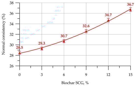 Figure 2 shows that the use of BSCG instead of part of the cement in all considered ranges (0% to 15%) increases the water requirement of cement pastes. At 3% and 6% BSCG, the normal consistency of the cement pastes increased by 2.81% and 7.72%, respectively. The introduction of BSCG at concentrations exceeding 6% leads to a significant increase in the water demand for cement pastes. With a maximum BSCG content of 15%, the highest value of normal consistency of cement paste was recorded, which was 28.77% higher than that of the control. The primary reason for the increased water demand in cement pastes containing BSCG is the porous structure of the BSCG particles, which requires more water for effective wetting. We also note that the particles of the spent coffee grounds initially have a more dense and solid structure, and they acquire a porous structure during the thermal decomposition process. Studies by other authors [,] have validated an increase in the water consumption of cement pastes containing biochar-based additives.