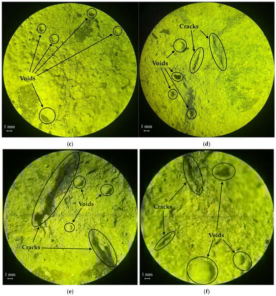 As shown in Figure 5, cement pastes with 3% BSCG content (Figure 5b) have the most integrity and uniform structure compared to cement pastes with an ordinary composition (Figure 5a) and those with 6% and 9% BSCG content (Figure 5c,d). Samples of cement pastes with 12% (Figure 5e) or 15% (Figure 5f) BSCG content have the worst structure, with numerous voids and cracks.