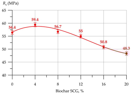The expression of the correlation between the compressive strength of concrete (Rc) and the quantity of BSCG (Figure 7) was calculated as follows: