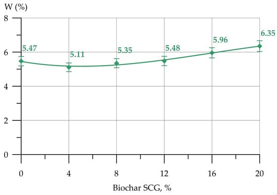 Figure 8 shows that concrete modified with 2% or 4% BSCG exhibited the lowest value of water absorption. At 6% and 8% BSCG, the water absorption of concrete remained approximately at the control composition. The positive impact of BSCG (up to 4%) is attributed to its ability to act as a filler and compact the structure of the concrete composite. However, when BSCG content increases by more than 4%, the binder content is reduced, and the addition of biochar no longer functions as a filler, which negatively affects the concrete properties.
