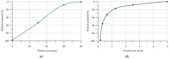 Particle size distribution: (a) Portland cement (PC); (b) BSCG; (c) granite crushed stone (CrS); (d) quartz sand (QS).