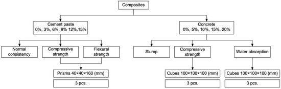The current process of construction is dynamic and continually encourages the incorporation of innovative practices. The impact of innovation in construction extends to design solutions and technologies, and one particularly promising and knowledge-intensive field is construction materials science []. Construction materials science lies at the convergence of multiple scientific disciplines and serves as a compelling arena for exploring innovative materials, necessitating a preliminary examination from a fundamental standpoint. The creation of new materials is a key task in various aspects, including economic, environmental, and technological [,]. To solve any material science problem, it is important to consider the perspectives of ecology, economics, and manufacturing. Many studies have demonstrated the potential of introducing various types of waste into construction materials. This includes industrial waste such as slag, stone flour, and micro-silica [,,,,]; waste from oil and fuel industrial complexes in the form of fly ash [,,]; and many others.