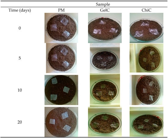 Ten days into the experiment, GelC became brittle, an occurrence attributed to the leaching of the plasticizer. After 20 days of exposure, GelC and ChiC showed a weight loss of 68% and 55% (Table 2), respectively. At the end of 25 days, GelC showed 80% weight loss, while ChiC only 58%. Observations indicate that GelC degrades faster than ChiC, since at day 70, a weight loss of 97% could be observed for ChiC. This occurrence can be attributed to the crystallinity of cellulose and chitosan. Since they have complex structures, microorganisms take longer to adapt and break the bonds between the glucose units [], making biodegradation slower. The results showed that microbial activity in the soil for each sample could be easily observed after the first few days, similar to the biodegradation studies with cotton and linen fibers [], which presented a behavior similar to that found here, this referring to biodegradation times and without forgetting that cellulose is the main component in both cases.