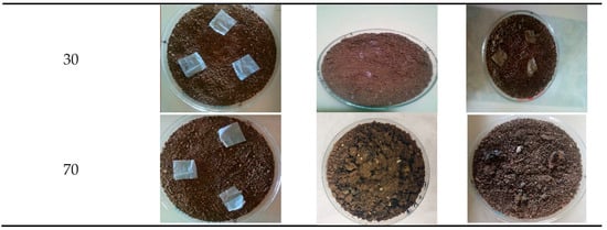The samples were cut into 3 cm2 pieces and placed on the surface of the Petri dish with the soil sample. The weight loss assessment was determined gravimetrically; the samples were weighed at 5, 10, 15, 20, 30, and 70 days of degradation. For this, four records were taken per sample; using the ANOVA statistical method p < 0.05, the data obtained were analyzed. A transparent mulch LDPE sample (0.1 mm thick) was used as a reference (hereafter PM). The samples were cleaned and dried at 60 °C for 24 h, weighed, and the final weight was recorded. Weight loss was calculated using Equation (1), and photographic analysis was performed [].