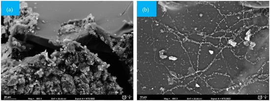 In the GelC film, small spherical structures, similar to gelatin particles, were observed (Figure 4a). However, after 25 days, the sample was completely fractured, and the analyzed fraction that could be recovered showed the growth of mycelia and pores on the surface (Figure 4b). The presence of mycelium is causing damage to the surface of the GelC sample []; likewise, weight loss was observed, as detailed in Table 2.