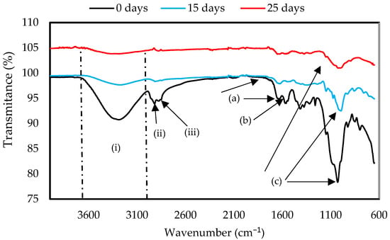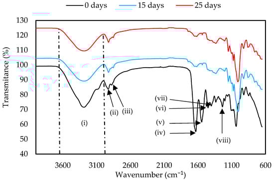 The functional groups of the GelC and ChiC materials were determined before and on day 25 of the test, which has been considered the end of the biodegradation test for this sample, as by day 30, it was not possible to have a sample for analysis due to its almost complete biodegradation (see Figure 2). Both samples showed three intense signals at the beginning of the test (Figure 6 and Figure 7). The first signal corresponds to the stretching of abundant hydroxyl groups (−OH) in polysaccharides between 3600–3000 cm−1 (i), which belong to cellulose, glycerol, and water. It also indicates the presence of H-N-H bonds present in amino acids [] and chitosan []. The intensity of these bands, as well as those of other peaks, decreased due to the loss of moisture in the samples and the partial breakage of intermolecular and intramolecular hydrogen bonds []. Additionally, this region can be assigned to the symmetric and asymmetric stretching vibrations of skeletal CH and CH2 in polysaccharides []. The second and third peaks occurred in the region of 2920 cm−1 (ii) and 2852 cm−1 (iii), corresponding to the vibration of the H-C-H bond of polysaccharides [,]. At the start of the test, the GC sample presented a band at 1630 cm−1 (iv), a signal corresponding to the C=O stretching vibration present in primary amides. A water band appears at this same signal and can shift depending on the strength of interactions []. The signal at 1541 cm−1 (v) corresponds to the stretching vibration of the N-H present in secondary amides, while the signal at 1449 cm−1 (vi) is attributed to aliphatic C-H bending vibrations. The intense peaks at 1335 (vii) and 1233 cm−1 (viii) indicate the stretching vibrations of the C-N bond present in amino acids [,]. The decrease in the peaks at 1630, 1541, 1337, and 1206 cm−1 indicates the breakage of the amide groups and C-N bonds present in gelatin, as is shown in Figure 6.