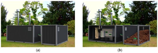 Figure 3. (a) The installation proposal for PelleTech boiler inside containers. (b)The sectional view of the container reveals the functional layout and equipment (source: the proposal is based on communication with Camino Design G. Samoukatsidis Bros, who supplied the required information [26]). - Fuel supply system for woodchip boiler with back burn return protection diaphragm;