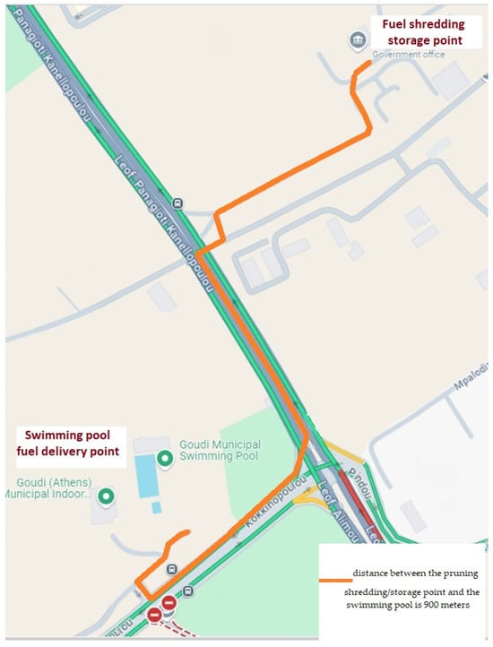 The total cost of the woodchip fuel is a sum of the costs of the shredding and the refueling process of the biomass equipment [30]. Τhe shredding cost was calculated to be 45 EUR/t based on the tender for the management and collection of pruning products by the Department of Greenery and Urban Fauna of the Municipality of Athens in the framework of the Services of General Economic Interest (SGEI) Compliance Documentation Report for Biowaste Management Actions [30]. The refueling costs were calculated to 1.37 EUR/t of delivered fuel. The existing truck of the municipality with a 10 m3 capacity will deliver fuel up to 4 times a day to fill the fuel silo with a capacity of 37.5 m3. Based on the specific weight of the prunings (100 kg/m3), the truck will deliver 1000 kg of woodchips to the silo each time. The distance from the fuel storage area to the biomass consumption point is 900 m (Figure 4). The truck will cover 1800 m for a complete delivery, consuming 0.9 L of diesel based on the average fuel consumption of 0.5 L/km (Greenery and Urban Fauna Directorate, personal communication). The price for diesel fuel is EUR 1.527 per liter, resulting a delivery fuel cost of EUR 1.3743 per delivery or 1.37 EUR/t. Since labor costs are not included in the biomass supply costs, as municipal employees are used for this process, the calculation of the woodchip-fuel cost is 46.37 EUR/t [31].