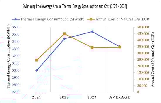 Figure 5 provides a comparative analysis of the annual thermal energy consumption and natural gas costs for the Municipal Swimming Pool of Athens from 2021 to 2023. This visualization highlights the variations in energy demand and associated costs across the three-year period, offering insights into the financial impact of energy consumption on municipal operations. By displaying both the thermal energy consumption (in MWh) and natural gas costs (in EUR), Figure 5 shows potential trends and fluctuations that could influence future energy management strategies. These findings serve as a preliminary basis for exploring sustainable and cost-effective energy solutions in municipal infrastructure, particularly in the face of fluctuating fuel prices and growing energy demands.