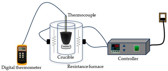 Figure 1 shows a scheme of the experimental arrangement used to develop the trials. An electrical furnace containing a SiC crucible of 0.5 kg capacity was used to melt the mixtures. The temperature was regulated with a temperature controller with a precision range within ±10 °C of the set values. In addition, the temperature was externally measured with a K-type thermocouple.