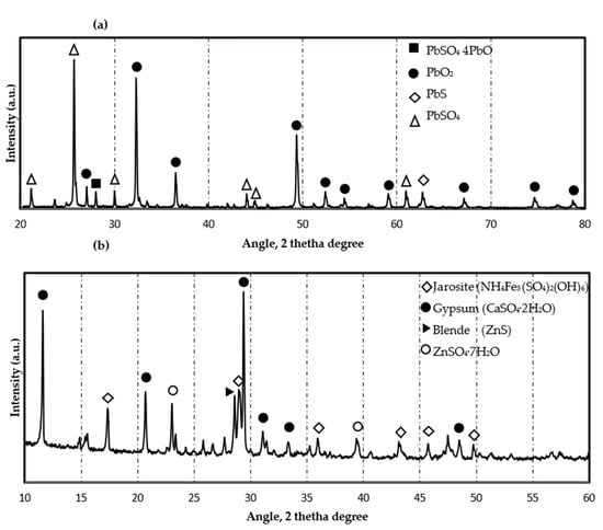 It is observed that the main components in the lead paste are galena (PbS) and Pattnerite (Pb2O), with lower quantities of lead sulfate (PbSO4) and lead oxide sulfate (PbSO4 · 4PbO). Moreover, the mineralogical compounds in the jarosite residue are mainly ammonium jarosite ((NH4)Fe3(SO4)2(OH)6), gypsum (CaSO4·2H2O), blende (ZnS), and a hydrated zinc sulfate (ZnSO4·7H2O).