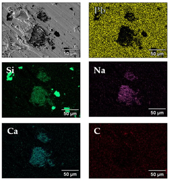 It was reported that SO2 release is avoided by the iron contained in the jarosite forming FeS(s) instead of SO2(g), and the addition of Na2CO3 to the melt improves the valuable metal recovery and the sulfur-fixation efficiency [24]. The metallic buttons obtained were analyzed with the SEM-EDS technique. Figure 3 shows a micrograph of the metallic sample, with its X-ray mapping images for Pb, Na, Si, Ca, and C for the mixture 30Na:40P:30J. The micrograph showed that the sample is mainly lead with some non-metallic particles embedded in the lead. These particles with different morphologies contain Na, Si, and Ca, which are considered as a part of the slag that could not be separated from the molten lead during solidification.