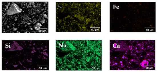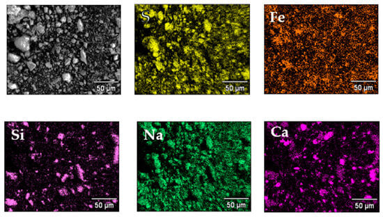 Figure 4 and Figure 5 show the slag analyzed by SEM-EDS for the trials 30Na:50P:20J and 30Na:40P:30J, respectively. It is observed that particles are constituted by sulfur, calcium, iron, silicon, and sodium mainly. It is well known that metallurgical enterprises use soda ash (Na2CO3) to desulphurize Na2S forming in the slag. Limestone (CaCO3) is also commonly used to remove sulfur as CaS; as a matter of fact, hydrated lime and calcite waste marble powder are used as remediation treatments for contaminated jarosite-rich sediments, forming compounds like iron oxides, hydroxides, and oxyhydroxides, which play a critical role in the immobilization of heavy metals [27].