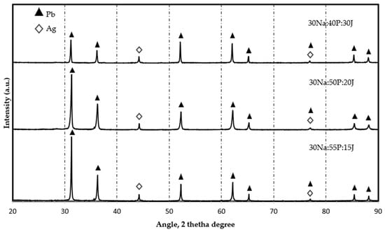 A quantitative fitting of the X-ray diffraction patterns of Figure 5 using the Rietveld method was carried out. The assessment reports a silver content of 0.2, 0.4, and 0.9 wt. % for the trials 30Na:55P:15J, 30Na:50P:20J, and 30Na:40P:30J, respectively. The silver measurements from the X-ray diffractograms are high considering the silver amount contained in the raw materials; however, they fit with the results obtained from atomic absorption spectrometry, where the highest silver content is obtained for the trial 30Na:40P:30J.