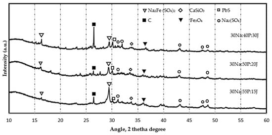 The trial containing the lowest amount of jarosite (30Na:55P:15J) formed the lowest amount of metallic and slag phases; however, the mass loss was the highest due to the SO2 volatilization. It should be noted that the mass loss was considerably decreased for the trials where the jarosite and lead paste amounts were increased and decreased, respectively. This behavior is related to sulfur retention as a compound in the slag.