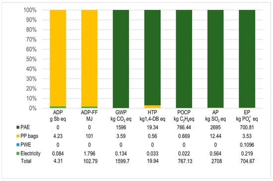 Figure 1 shows the percentual contributions of inventory flows to the environmental impact categories. The table just below the x-axis includes the absolute values of the category indicators relative to 1 t of BC. Inventory flows are grouped into four categories: (1) pyrolysis air emissions (PAEs), which are the direct emissions from the Kon Tiki kiln; (2) pyrolysis water emissions (PWEs), which are the direct emissions from using quenching water to stop pyrolysis (see Section 3.1 for the operation description); (3) indirect emissions from using electricity for water pumping, and (4) indirect emissions from polypropylene (PP) bag production. The PAE flows contribute up to 95% of impacts in all categories except for the ADP and ADP-FF, where the PP bag production dominates. The PP input is often overlooked in LCAs of biochar, leading to a large underestimation of the impacts in these two categories. The effects of electricity for water pumping and the metals content in quenching water (PWE) are negligible.