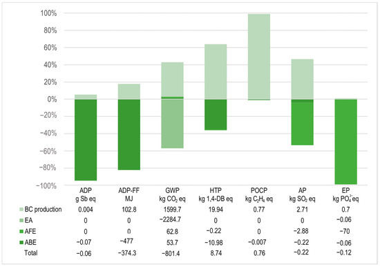 The abovementioned result explains the large differences between the impact factors between other works and those reported here, where air emissions from the Kon Tiki kiln are included, and there is no displacement of electricity or fossil fuels (see Table 4 and Figure 2). Also, using the pyrolysis residual heat as useful energy was not considered in this work either, as this is not feasible in the context of this study (device type and BC production in traditional small parcels). Even when the estimated benefits are smaller in this work’s results, the simplicity of the system and its functionality in a rural context make it an option with potential environmental benefits in many categories (based on the negative impact factors), on top of the direct economic benefits for the small parcel’s owners.
