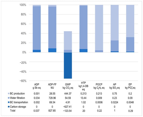 LCA studies on wastewater filtration using raw BC are scarce. Moreira et al. [44] reviewed LCAs of BC as a substitute for activated carbon. The best results were for poplar BC, with a GWP of −3890 kg CO2eq/t BC, where pyrolysis accounted for ~80% of the positive impact. Avoiding the use of fossil heat and charcoal led to GWP savings and reduced EP in 1.11 kg PO43−eq. These scenarios also include the stages of transportation, chemical usage, and biomass cultivation, though the pyrolysis stage was the main contributor. The GWP savings were larger in their study than in this study due to credits accounted for displacing activated carbon [44].