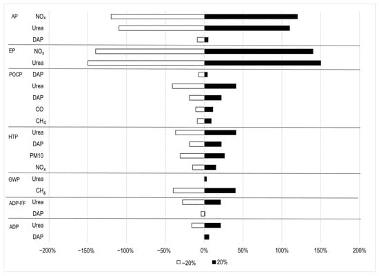 The production of mineral fertilizers (urea and DAP) is highly fossil-energy intensive. Hence, avoiding fertilizer production (APE) significantly reduces impacts in ADP, ADP-FF, and HTP, due to savings in mining and fossil fuel combustion. These savings lead to net negative impacts in ADP, ADP-FF, GWP, AP, and EP categories. GWP savings are driven by carbon sequestration in BC, and marginally, from the avoided N2O emissions (EA), while lower N-fertilizer use (AFE) reduces AP and EP. On the other hand, BC production emissions into the air outweigh the benefits of using BC in soil in the POCP category. These results show that the assumption of fertilizer reduction per tonne of BC will have a large impact on many category indicators, and therefore, it must be included in the sensitivity analysis.