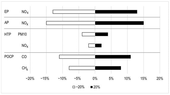 The GWP (1599.7 kg CO2eq/t) is largely due to biogenic methane emissions from incomplete combustion in the Kon Tiki kiln’s top layer [42]. Other gases, particulates, and products of incomplete combustion contribute to impacts on HTP, POCP, AP, and EP. Although NMVOC flows were included in the inventory, the CML-IA methodology lacks characterization factors for them, so their impact was not accounted for in these results. Identifying specific NMVOC species, which was not in the scope of this work, is crucial to understanding their effects on the POCP. Uncertainty in PAE flows was flagged for sensitivity analysis regarding POCP.