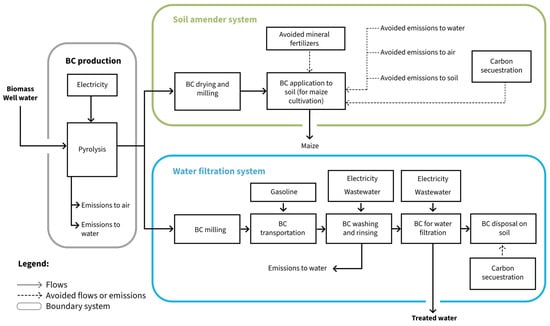 A less studied system is water filtration using BC, for which LCA studies are scarce. Some studies suggest that the GWP of activated carbon for tertiary treatment of wastewater is lower when produced from woody BC instead of coal [23]. Quispe et al. [24] reviewed BC filters for graywater reuse, reporting 99% removal efficiencies, depending on the filtering method and reuse strategy. Two LCAs found that the main environmental benefits of using BC-based activated carbon instead of coal-based activated carbon were in GWP (8.6 against 18.3 kg CO2eq/kg) [23], while its main impacts were on EP and carcinogenic HTP due to BC production emissions and electricity use [25]. Another LCA study [26] analyzed BC filters for wastewater from oil sands in Alberta, Canada, reporting a GWP of 80 kg CO2eq/m3, which includes carbon credits from the coproducts, syngas and bio-oil. No LCA studies have been conducted on BC for pig farm wastewater, which is the focus of this research.