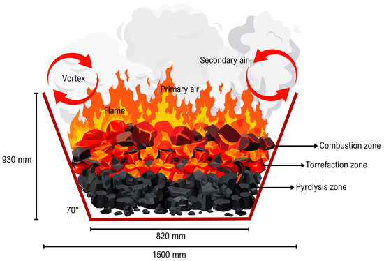 Once enough biomass is available on site, it is transformed into BC in Kon Tiki kilns. The detailed process using this equipment is described elsewhere [39]. The operation of the Kon Tiki kiln consists of starting an initial fire inside the conical kiln (Figure 8) and then adding layers of biomass. As the top layers start combusting, they provide heat and consume oxygen from the lower layers, where pyrolysis occurs. Before combustion consumes the top layer, a new layer is added on top. The temperature gradient in the kiln ranges from 600 to 900 °C (measured with an external surface thermometer), and due to the conical shape of the kiln, vapor recirculation occurs at the kiln’s mouth, enhancing the combustion of pyrolysis vapors and incomplete combustion products (see Figure 8).
