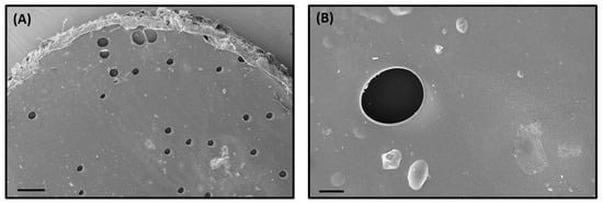 SEM micrographs of the BS after 7 days of exposure to UV-A radiation. Scale bars of 1 mm (A) and 100 µm (B).