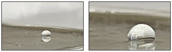 Contact angle tests were performed to evaluate the hydrophobic properties of the material. This test was conducted by depositing a water droplet on the material’s surface. Then, the contact angle formed between the droplet and the surface was measured. Contact angle experiments provide crucial information related to the material’s ability to repel or absorb water. If the contact angle is close to 180°, the material presents hydrophobic behavior, thus having low water affinity and repelling it [40]. On the other hand, if the contact angle is close to 0°, the material is hydrophilic, featuring a high capacity for water absorption. Figure 7 describes the contact angle experiment conducted on the bio-sequins.
