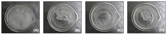 The pre-treated salmon scales were blended and homogenized with distilled water, glycerin, gelatin, and white vinegar to obtain the biobased sequins. First, 120 mL of distilled water were added to a pot. 24 g of gelatin, which acts as a binding material and hardening component [16], incorporated and homogenized in the distilled water at room temperature. Moreover, the development of the bio-sequins involved the incorporation of a plasticizer, in this case, glycerin [62]. The temperature of the mixture was increased to 60 °C and then a fixed amount of glycerin (6 mL) was added. To hinder microbial and fungi growth, white vinegar [63] (5 mL) was added to the mixture as the last ingredient. This component is crucial to extend the lifespan of the biobased material. Once a homogeneous consistency was attained, the mixture was poured into Petri dishes and allowed to dry in a desiccator for 8 h.