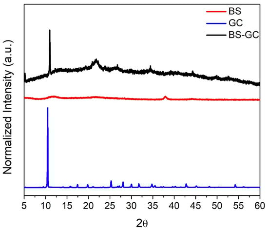In contrast, the XRPD pattern of the BS shows broad features, indicative of an amorphous or poorly crystalline structure. The absence of sharp diffraction peaks suggests that BS are composed of predominantly amorphous materials, likely due to the organic nature of their components, such as collagen and glycerin. Organic polymers and biopolymers, like those present in the BS, tend to form amorphous or semi-crystalline structures, which do not produce distinct diffraction peaks in XRPD patterns [45,46]. Moreover, the XRPD pattern of BS-GC shows a combination of the broad, weak features of the BS and the sharp, intense peaks corresponding to GC. While the ordered structure of GC predominates in the diffraction pattern, the overall intensity of these peaks is lower compared to pristine GC, likely ascribed to the immobilization of guanine within the amorphous BS matrix. This observation implies that GC retain their integrity when incorporated into the BS. Furthermore, the BS contribute primarly to the amorphous component of the material.