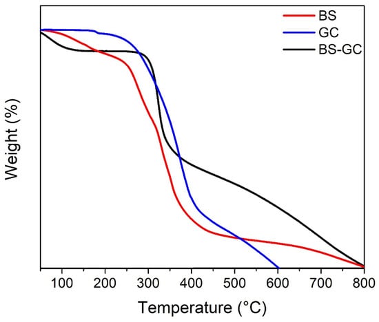 Thermogravimetric Analysis (TGA) of BS, the GC, and the BS-GC samples was performed on a TGA-4000 Pyris within a 25–800 °C temperature range to stablish the limits for temperature degradation of the materials. The samples were placed on an aluminum pan, and measurements were conducted under N2 atmosphere.