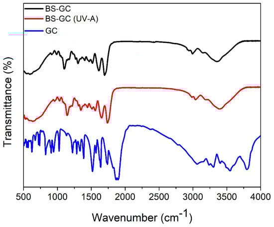FT-IR spectra of GC, BS-GC, and BS-GC before and after exposure to UV-A radiation.