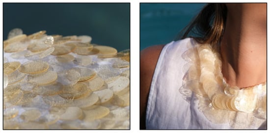 Sequins, small decorative accessories often found in garments and textiles, are typically manufactured using non-biodegradable plastics such as polyvinyl chloride (PVC) and polyester. Although sequins add aesthetic value to clothing, they also contribute significantly to the growing crisis of microplastic pollution; it is estimated that over 170 million tons of microplastics are currently floating in the world’s oceans [11]. These plastic particles, smaller than 5 mm in diameter, are detrimental to marine ecosystems. They are often ingested by marine organisms, ultimately entering the food chain and affecting both wildlife and human health through bioaccumulation and biomagnification [12,13,14]. The manufacturing, use, and disposal of plastic sequins eventually release microplastics to the environment which is a considerable challenge for waste management systems due to the size of these particles, that makes them difficult to filter or remove. Furthermore, the synthetic materials used to make sequins are derived from fossil fuels, leading to the depletion of non-renewable resources and the emission of greenhouse gases during production. In light of these environmental concerns, reducing or eliminating the use of polluting materials in textile accessories is critical.