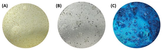 The decoration of the bio-sequin with GC was evaluated using two different procedures. The first method involved adding the crystals directly to the mixture described in the methodology. This resulted in the partial dissolution of the crystals, compromising their properties, especially their structure and brightness. The second method consisted in pouring the crystals into the mixture at room temperature, which proved to be more successful. This route allowed the deposition of crystals in the bio-sequin surface, without compromising their signature brightness. Further, a homogeneous distribution of the crystals in the bio-sequin’s surface was also observed. This strategy ensured the deposition of the guanine crystals without compromising the structural integrity of the bio-sequin, as well as the quality and visual appeal of the final product. The obtained bio-sequins decorated with GC are illustrated in Figure 10.