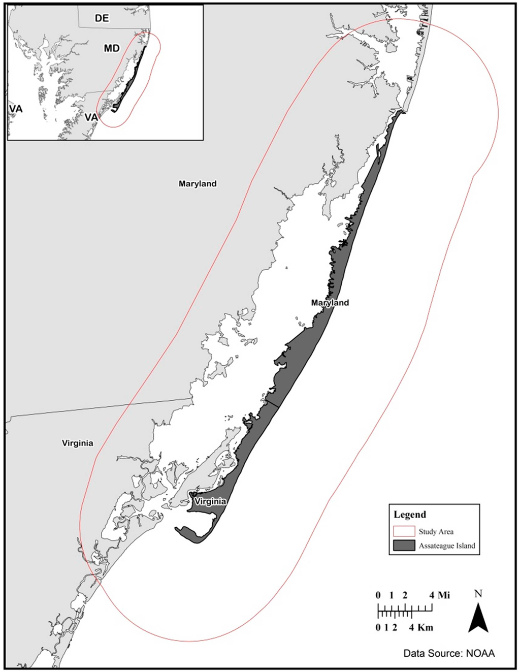 Assateague Island is an undeveloped barrier island and part of the Delmarva (Delaware-Maryland-Virginia) Peninsula on the Mid-Atlantic Coast (Figure 1). Assateague is managed by three government agencies. The National Park Service (NPS) manages most of the land within the Maryland portion of the island as well as some within Virginia. The U.S Fish and Wildlife Service (USFWS) manage the lands within the rest of Virginia known as the Chincoteague National Wildlife Refuge. The third agency is the Maryland Park Service (MPS) who manages a small, 3 km long portion of the island within Maryland as a state park. The island is mostly undeveloped with the exception of a few roads and parking lots, as well as campgrounds []. Coastal storms are responsible for creating and maintaining a number unique habitat types that support a variety of important species such as the threatened piping plover (Charadrius melodus) as well as numerous migratory birds, deer, and the famous wild horses [].