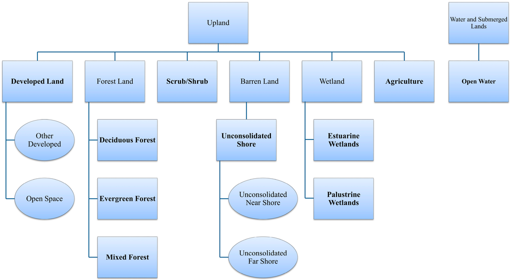 A modified version of the NOAA C-CAP classification scheme [] was chosen for all the land cover mapping in this study (Figure 2). The original 25 classes were condensed to 10 based upon a priori knowledge of the study area and an examination of previously generated NOAA C-CAP land cover maps. The classes in bold are the final land cover classes used. To improve classification accuracy, four temporary classes were added in order to decrease the spectral variability of the developed and unconsolidated shore classes.
