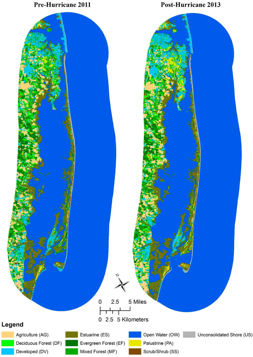 For this study, data from two Landsat satellites were used. The pre-Hurricane Sandy imagery was collected by the Landsat 5 Thematic Mapper (TM) sensor while the post-Hurricane Sandy imagery was collected by the Landsat 8 OLI sensor. Hurricane Sandy struck the east coast in October 2012, almost a year after Landsat 5 was decommissioned (November 2011). While Landsat 7 was functional during the time of the hurricane, the failure in the scan line corrector made the data unusable for this study.
