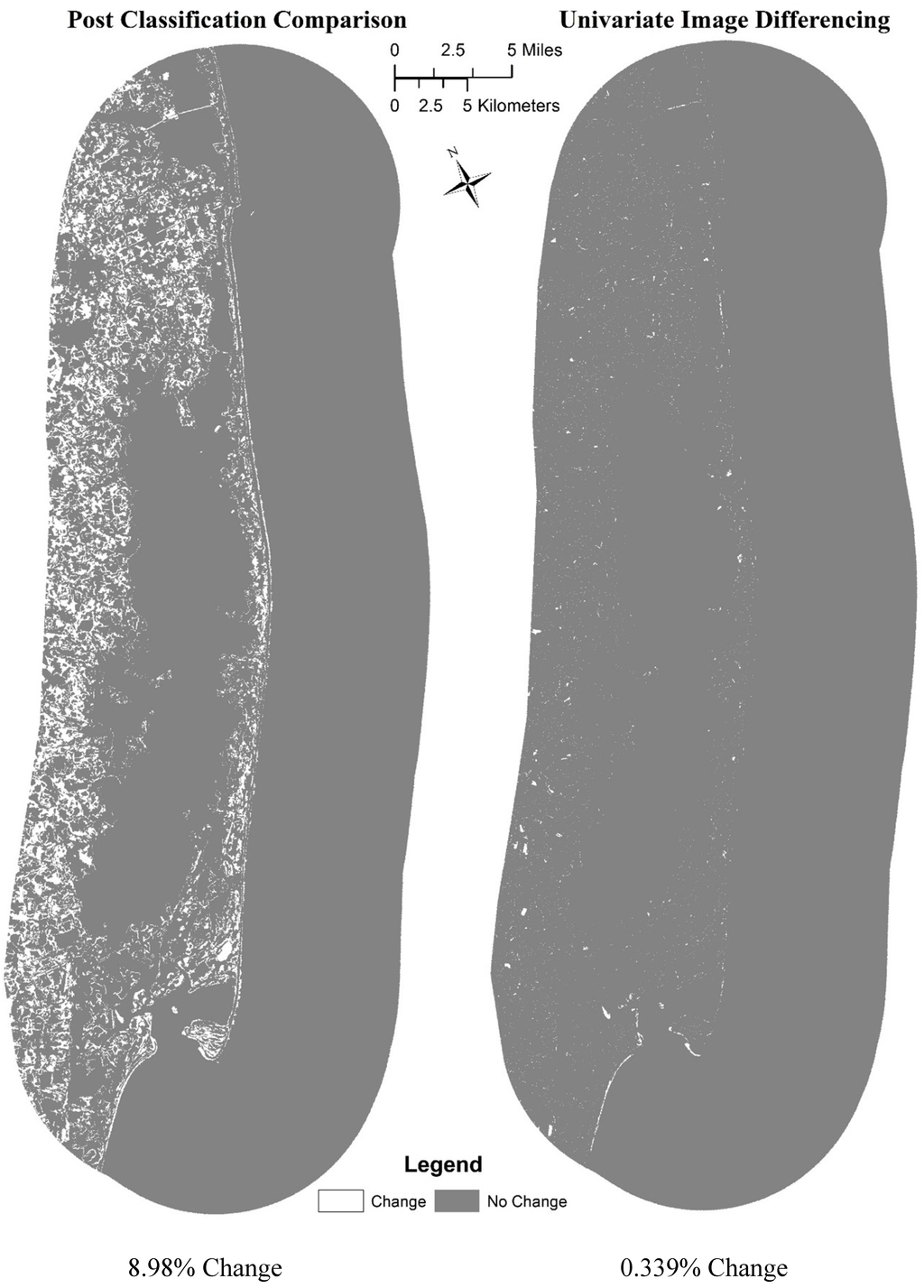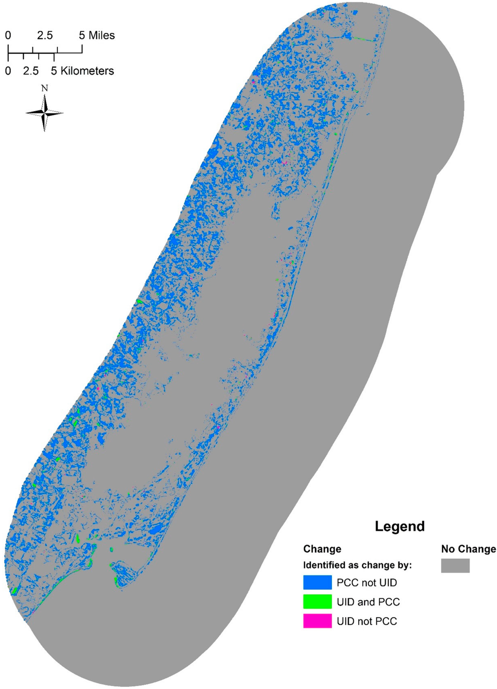 One of the major objectives of this study was to quantify the land cover change that occurred on the island as a result of Hurricane Sandy. The UID approach was implemented to detect changes and then update the post-hurricane map in order to generate a more consistent pre-hurricane map. From there, the land cover totals and differences were calculated. The PCC was also implemented to detect where change had occurred and the type of change using the information provided in both single-date maps.