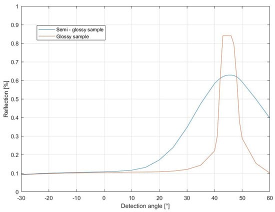 In Figure 2, two BRDF measurements are shown. The measured samples are mat and glossy 2.5D printed samples. The samples were measured with the incidence angle at 45° at the wavelength of 580 nm. For easier interpretation of the reflection distributions, the reflection scale is logarithmic. From the height of the specular peak, we can notice which BRDF curve represents which object. The specular peak is the most important component of gloss. For different materials, the specular peak is strongly dependent on the refractive index (n). The higher the refractive index, the higher the specular peak. The size of the peak from a measured surface also depends on the angle of incidence. The peak increases when the incidence angle increases [6]. The specular reflection will be bigger when illuminating the object under a grazing angle (e.g., 85°). Therefore, ISO 2813 standard recommends three incidence angles, 20°, 60°, and 85° geometries [7]. The 60° geometry is used for intercomparing the gloss of most specimens. The 20° geometry is advantageous for comparing specimens that have a 60° gloss higher than 70 GUs (Gloss Units), whereas the 85° geometry is used for comparing specimens for sheen or near-grazing shininess. It is mostly applied when the 60° geometry gloss is lower than 10 GUs.